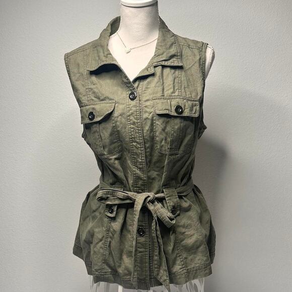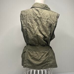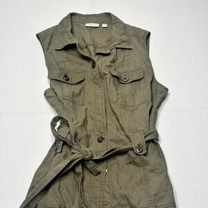 New York Company Size XL Vintage Olive green sleeveless utility Top with a flattering belted waist and button-down front. Features four front pockets and a structured collar for a Vintage military-inspired look. Lightweight and perfect for layering over tanks, tees, or long sleeves. Versatile for casual, outdoorsy, or street-style outfits.