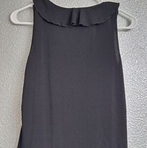 black fabric rose surrounded by two ruffled ties, small collar with scoop neck, peplum hemline with ruffle