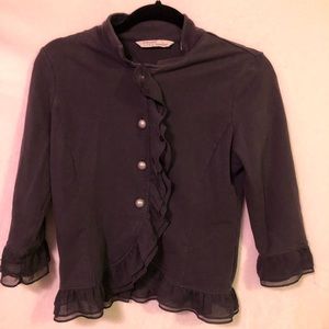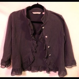 From the NY&C Streetwear line: size XS, dark slate grey jacket with half-sleeves. Fashionable military-style silver buttons and collar, ruffle along placket and sleeves. Soft material and flattering lines, perfect to toss over a cocktail dress or to dress up a casual top and jeans!