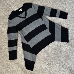 Oversized Sweater. Long Sleeve. V Neck. Ribbed Neckline. Ribbed Sleeve Cuff. Ribbed Asymmetrical Hem. Striped Design. Interior Fabric Tag.
