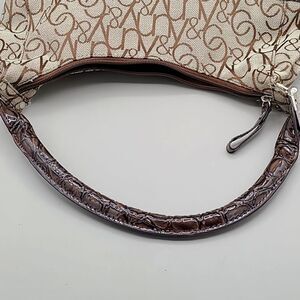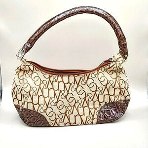 New York & Company Tan & Brown Canvas Handbag with Embossed Patent Trim