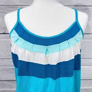 New York & Company tank top. Size medium. Spaghetti strap. Aqua color tank with dark blue, light blue and white strip across top of front. Back is plain aqua color. Elastic at waist. 100% Rayon.
