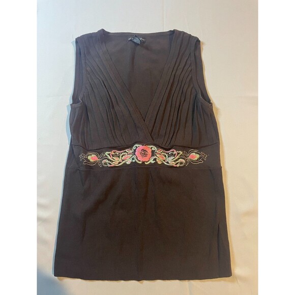 New York & Company Tank Top Women Medium Brown Knit Embroidered Floral Faux Wrap