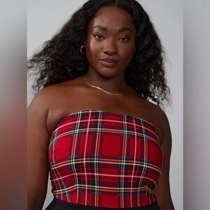This listing is for a NWT's New York and Company Tartan Bow Train Jumpsuit in size 2X. This sexy jumpsuit has a strapless design along with a cute back bow detail. With a classic tartan print and asymmetric hemline, this piece blends style and tradition. It also has a chic straight leg with functional side pockets. Please see photos for measurements.