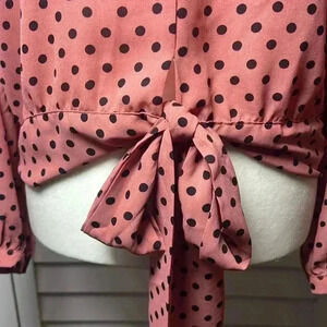 New York & Company V-Neck Ruffle Balloon Sleeve Tie Front Polka Dot Top Size M