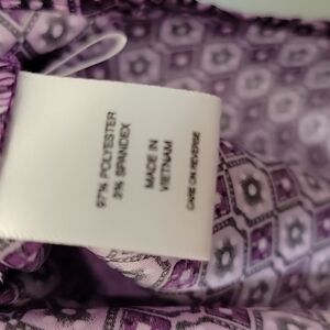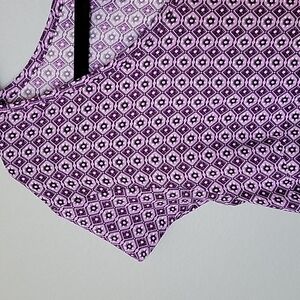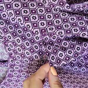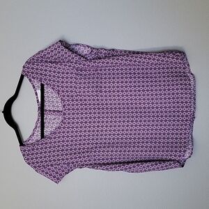 Loose fit. Lightweight fabric, doesn't stretch. Buttons down the back. Short sleeves. Can be worn with a blazer for work or dressed more casually. Great condition. Dark purple, lighter purple, black and white geometric pattern. Pocket at the chest. No size tag so please see measurements. Would be loose fit on a 0X probably a little more snug on a 1X. Girly, office, statement, workplace, brunch, colorful, going out, Y2K, 00's,feminine, girly