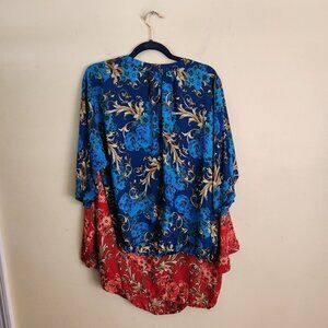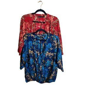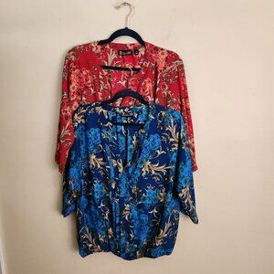 New York & Company Vintage Set Of 2 Popover Blouses, Size XL. Pit to pit 23", shoulder to hem 25", Red Blue Floral V Neck, 3/4 Sleeve, Pleated Front Detail, Elastic Waist, Career Wear, Comfort. Good Pre-Owned Condition
