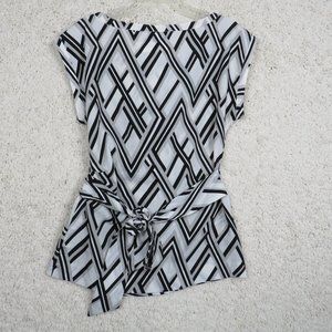 Pre-Owned, Excellent Condition! 100% Polyester. Black, White, Gray Design. Belted.