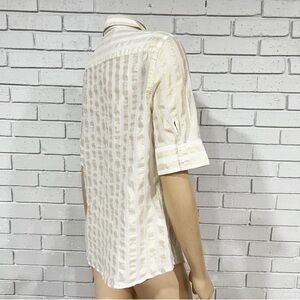Gently used striped button down, gold has a bit of luminescence to it. Length 26.” Armpit to armpit measurement lying flat 18.” Shoulder sleeve length 10.” Shoulder to shoulder measurement lying flat 15.”