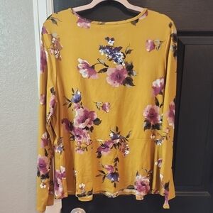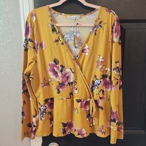 This elegant blouse from New York & Company features a vibrant yellow base adorned with a striking floral pattern in purple hues. The long sleeves and wrap design with a tie front create a flattering silhouette, making it a versatile addition to any wardrobe.
