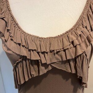 New York & Company beige tank top with ruffle around rounded neck and down side of chest, Size Medium