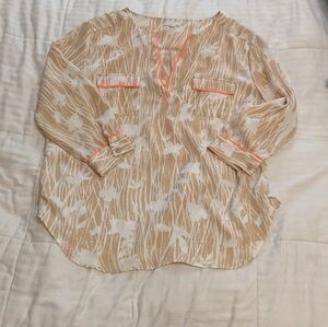 New York & Company slightly sheer abstract floral wheat print with bright orange piping size XL. There are 2 breast pockets with the orange piping and piping around the v-neck collar. there are buttons on the ends of the sleeves. super cute
