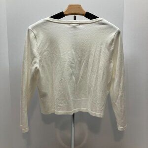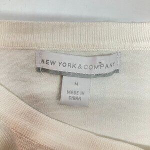 Great condition! Hook and eye closure at top as shown in picture. Crafted for comfort and style, the New York & Company white cropped cardigan is a versatile addition to any wardrobe. This medium-sized, regular-fit sweater features elegant 3/4 sleeves and a tight-knit fabric that ensures both warmth and breathability. Its solid white color is accented with sparkling rhinestone buttons, adding a touch of glamour to your ensemble. The cardigan is machine washable, making it a practical choice for daily wear. Its lightweight design and open-style front allow for easy layering over your favorite tops and dresses. Whether you're dressing up for a casual outing or simply relaxing at home, this cardigan is a go-to for a chic, effortless look.