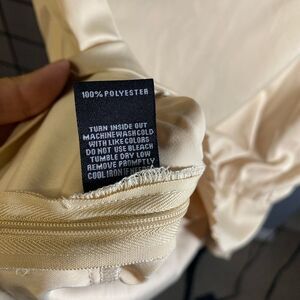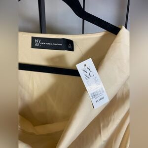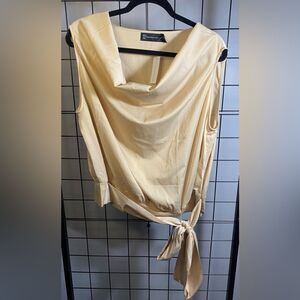 Beautiful New York & Company top in color neutral bone. Has a high cowl neck. Sleeveless. Elasticized at the back of the waist. Hidden zipper up the side. Has a tie at the waist that can worn a variety of ways tie win the back or front. New with tags. Measurements from manufacturer are in the pictures.