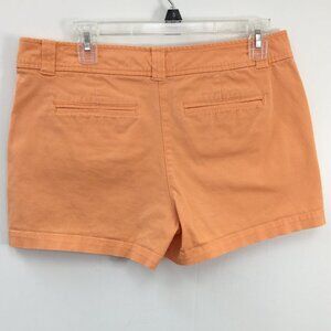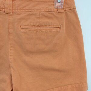 New York and Company Orange short (middle pictured), two side slip pockets, button hook zipper front closure, belt loops, two back faux pockets, straight thigh hem with slits at sides, casual, outdoor, summer, comfortable, 3.5" inseam, some very minor fading of color at seams, doesn't effect function, cotton blend, soft, breathable