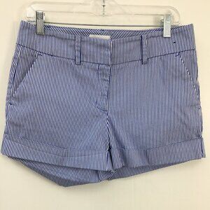 New York and Company blue and white vertical striped shorts (right pictured), two side slip pockets, double button hook zipper front closure, belt loops, two back button pockets, cuffed thigh hem, casual, outdoor, summer, comfortable, 3.5" inseam, cotton blend, soft, breathable