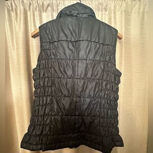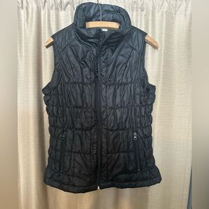 Stylish black puffer vest. Features a high collar and zip closure. Perfect for layering.