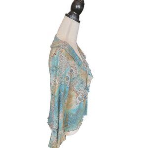 Very pretty teal, brown and beige long sleeve blouse in Size Large by New York Design Company. It has a v neckline with ruffles all around the neckline and down the center of the bodice. The sleeves end with a ruffle. Not too sheer that you would need a camisole underneath. Flowy look, comfortable fit.