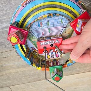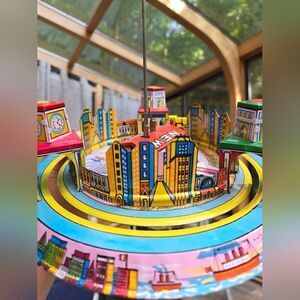 Step back in time with this charming clockwork tin toy, a faithful reproduction of a 1920s classic by Marx, lovingly crafted by Schylling. This vibrant, limited edition vintage piece is more than just a toy; it’s a miniature mechanical marvel. Watch in delight as the little train goes around its colorful track, traversing through a bustling cityscape and winding tunnels, while a jaunty plane circles overhead. Every detail is meticulously designed to bring joy and nostalgia, making it a perfect collector's item. And yes, the delightful box is included, enhancing the old-world charm of this working vintage treasure.