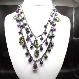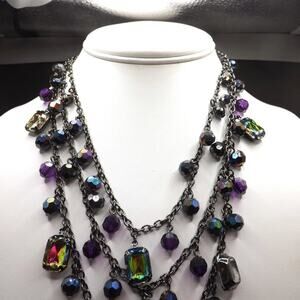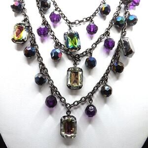 *Description: This is a beautiful New York and Company necklace with hanging rhinestones and beads, iridescent in color which gives reflections of purples and blues on a gunmetal gray chain in three strands. There is a hang tag with NY and a lobster clasp. This would be a great addition to your jewelry collection or make a great gift!