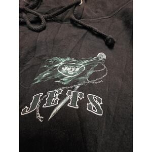 The product is a New York Jets NFL men's size 2XL black hoodie, officially licensed by the National Football League. This hoodie is perfect for football fans who support the New York Jets and want to show their team pride. Made for men, this hoodie is a stylish and comfortable way to represent the team during the season. Perfect for game days or casual wear, this hoodie is a must-have for any Jets fan.
