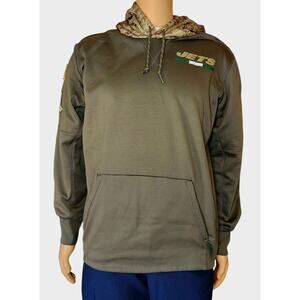 The New York Jets Salute to Service Nike Therma-Fit Hoodie in Men's size Large features a camouflage pattern in green, perfect for showing patriotic spirit. This pullover hoodie has long sleeves, a drawstring closure, and a hood for added warmth. Made from fleece fabric, it is machine washable and designed for regular fit. Ideal for winter, fall, or spring seasons, this Nike hoodie is a stylish and comfortable addition to any man's activewear collection