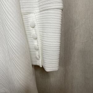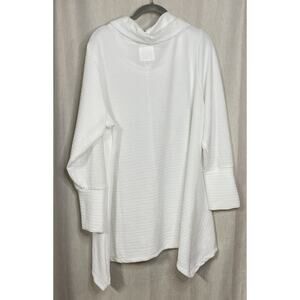 Measures 24” P2P and 30” long approximately. The product is a white long sleeve button cuff tunic top by New York Laundry in size 2X. It features a cowl neck and striped pattern, with a relaxed fit and asymmetrical hem. The top is made of a blend of polyester, rayon, modal, and acrylic, and includes accents of buttons. This stylish blouse is designed for plus size women and offers a trendy tunic length, ribbed texture, and classic/fitted sleeves, making it a versatile addition to any wardrobe.