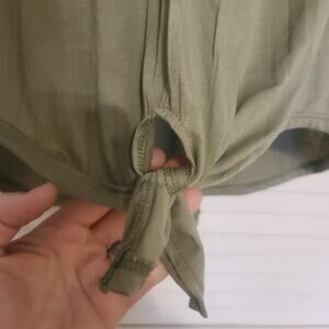 NWT size small 100% polyester v neck top with embellished neckline. Front tie at hem for a cute look. Shoulder to hem measurements 22 in. Armpit to armpit flat lay 19 in. Cute for spring and summer!