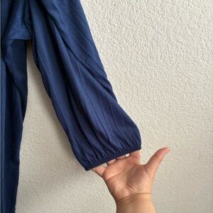 Stylish navy cold shoulder top with lace details. Perfect for casual outings.