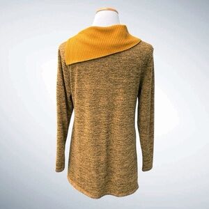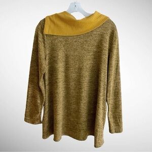 It has a large ribbed split neck with decorative buttons on the side. The sweater has long sleeves and working snaps on the bottom of both sides so they can be worn open or snapped shut.