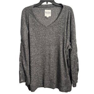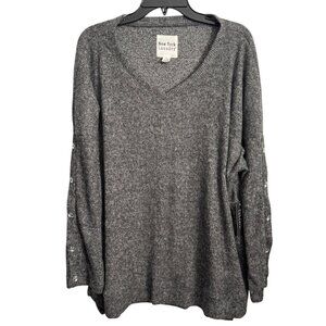 New York Laundry Womens Grey Knit V-Neck Sweater Size 2X With Button Sleeve Deta