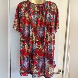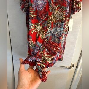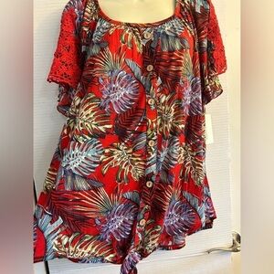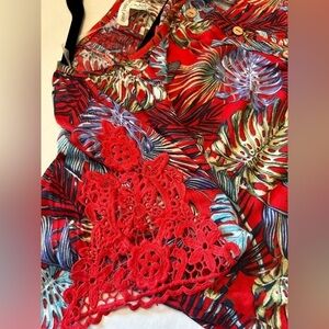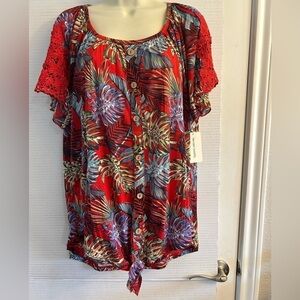 New York Laundry red tropical leaf print shirt top in size 2XL with round neck, decorative buttons, hi lo hem, tie front, & crochet detail. NWT