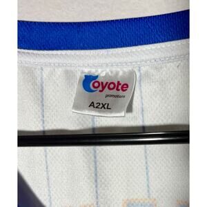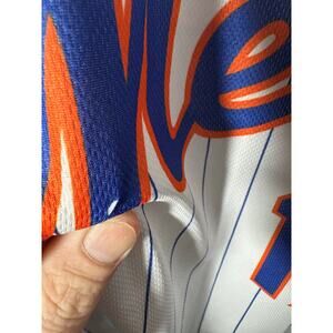 This replica jersey has no stains but has one blemish. We are not sure if we should call it a hole or a rip because it really isn’t either. It is more af a slice on the M of Mets. Because of its location it does not go through the jersey. Please see photos for picture of this along with measurements.
