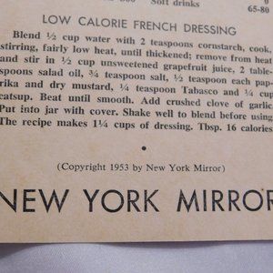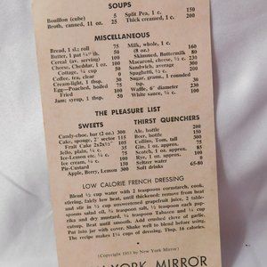 Vintage 1953 New York Mirror's Pamphlet Paper Calorie chart. Breaks down calories within an array of food and beverage groups.
