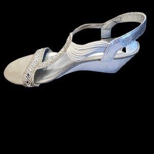 New York Transit BADGETASTIC WEDGE SANDAL. Silver sparkle open toe.