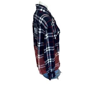 Relaxedomfy soft plaid flannel red white blue plaid and a New York Yankees applique graphic on the back, upcycled from a flannel.