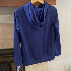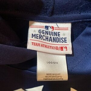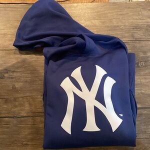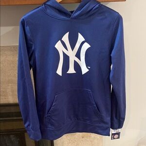 Stylish New York Yankees hoodie. Features a bold logo on the front. Comfortable and perfect for fans. It’s a mix between a T-shift and a sweatshirt. Size is a boys L 12/14, but would fit woman size S or M. Brand new with tags from a smoke free home.