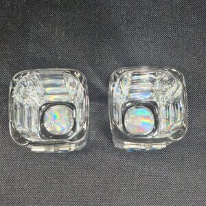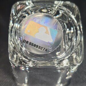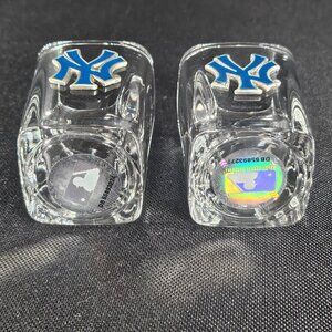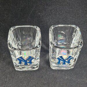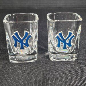 A pair of very nice New York Yankees MLB square shot glasses. They have the MLB label on the base of each glass. New condition. They had the sticker price still on the glasses. They show no wear. The New York logo is metal and has navy paint enamel accents. Approximately 2.5 inches tall. Non smoking pet free home.
