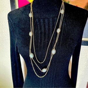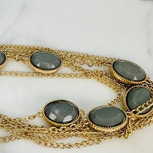 New York and Co Long Necklace Green Station Stones Multi Strand Gold Tone 35”
