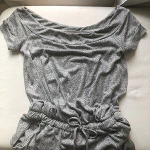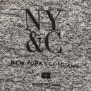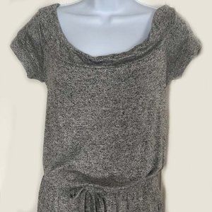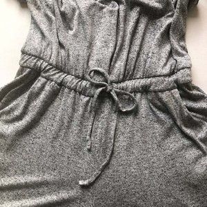 Super cozy and cute! Marled charcoal gray and black one-piece jumpsuit in size Medium by New York and Company. Full elastic waistband with drawstring tie. Side pockets. Banded cuff & cap sleeve. Ankle length. Sits just below waist. Stretchy fabric. Relaxed fit through hip and thigh. Great style and comfort.