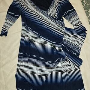 This dress has a beautiful diagonal stripe pattern in shades of blue, white, and black, giving it a modern and dynamic look. It has 3/4" in sleeve and a fitted silhouette, making it versatile for both casual and dressy occasions. Style PH 110001