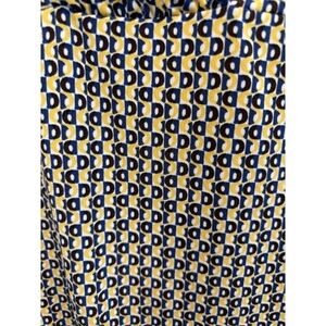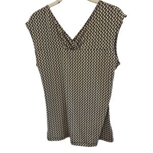 This is a women's blouse made by New York and Company. It features a geometric pattern in yellow and blue, a V-neckline, and a faux wrap style. The blouse is sleeveless and made from a stretch knit polyester spandex blend fabric. It has a pullover closure and is machine washable. The blouse is a regular fit and comes in size large. It is suitable for travel and casual occasions.