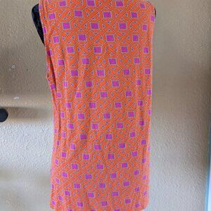 New York and Company flowy tank. Geometric patterned with bright orange, purple and gray colors. Pleated scoop neck collar. Flat measurements armpit to armpit 18", shoulder to bottom hem 26". 95% rayon 5% spandex.