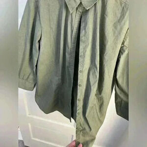 New York and Company brand olive green button-down blouse meant to fit slightly oversized and flowy