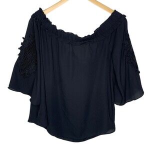 new york and company zara banana republic jcrew whbm anntaylor loft black top blouse off shoulder lace embroidered flutter sleeve boho casual weekend party nightout feminine girly