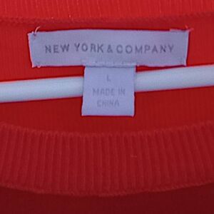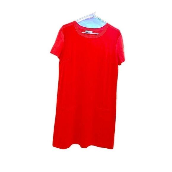Pre-owned New York & company short sleeve shift dress. Color is orange red front is suede like an appearance has pockets in front also. Back is knit sweater like material. Dress is Midweight.