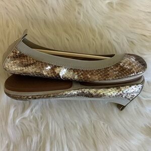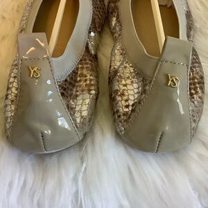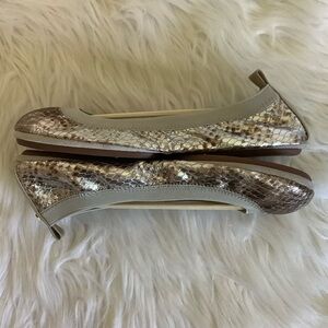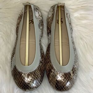Samara metallic silver, brown and gold foldable leather ballet flats with super cushioned sole for comfort. Elastic band around top of foot. YS heel tab emblem. Great shoes for traveling.