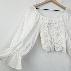 ZARA Bohemian Peasant Balloon Sleeve Swiss Dot Ruched Ruffles Cropped Blouse Top. Pair it with your favorite high waisted jeans!