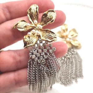 Gold flowers with faux pearl centers, rhinestone embellishments and silver chain fringe Tassels