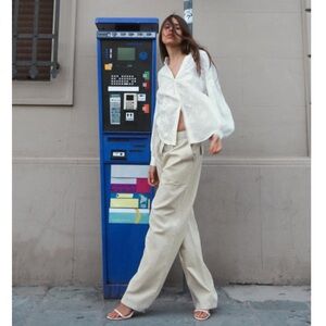 Shirt with round collar and v-neck. Long sleeves and front button closure.